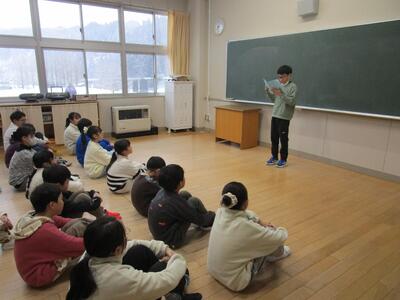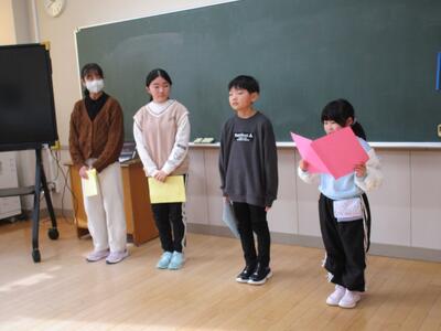 代表児童4名が、2学期を振り返って作文を発表しました。しっかりと自分を見つめて成長を作文に表した代表の4人が素晴らしいことはもちろんですが、発表を聞いている子どもたちも素敵でした。うなずいたり拍手をしたりしながら真剣に発表を聞く姿から、どの子も充実した2学期を過ごせたたことが伝わってくるようでした。