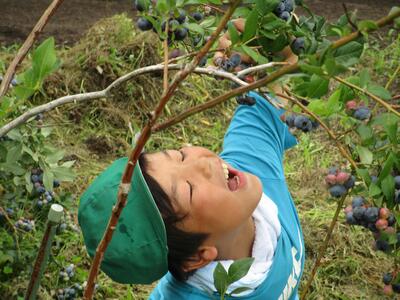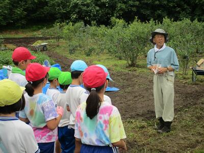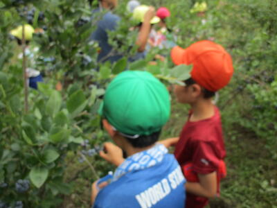 稲作体験でお世話になっている高田一実さんのお宅に伺い、全校のみんなでブルーベリー摘み取り体験を行いました。とれたてのブルーベリーは甘く、ほんのり酸味もあり美味しく、収穫したブルーベリーはあっという間に袋いっぱいになりました。品種も大きさもおいしさも様々、みんなの楽しい笑顔が印象的でした。「小さな学校 大きな力」、地域あっての学校、地域の方々とのつながりに感謝です。
